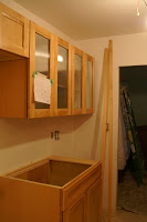 So week two of Team Liz's renovations has been completed. Week two was a little less exciting than week 1 where there were major changes but no less important in the scope of completing this project on time. Things accomplished this week included the completion of all the electrical in the bathroom, the creation of a bigger space for a new medicine cabinet, the patching of the wholes in the closet and the prepping, sanding and priming of the kitchen and both closets and finally on Friday the pre-flooring was put down in the kitchen in preparation for installing the stone floor during week 3. Here are a couple photos from last week.